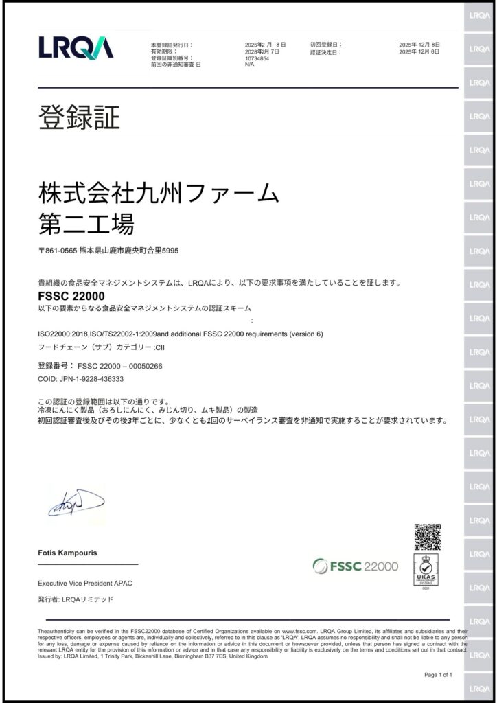 業務用おろしにんにく・しょうが製造元 HACCP認証取得 株式会社九州ファームです。